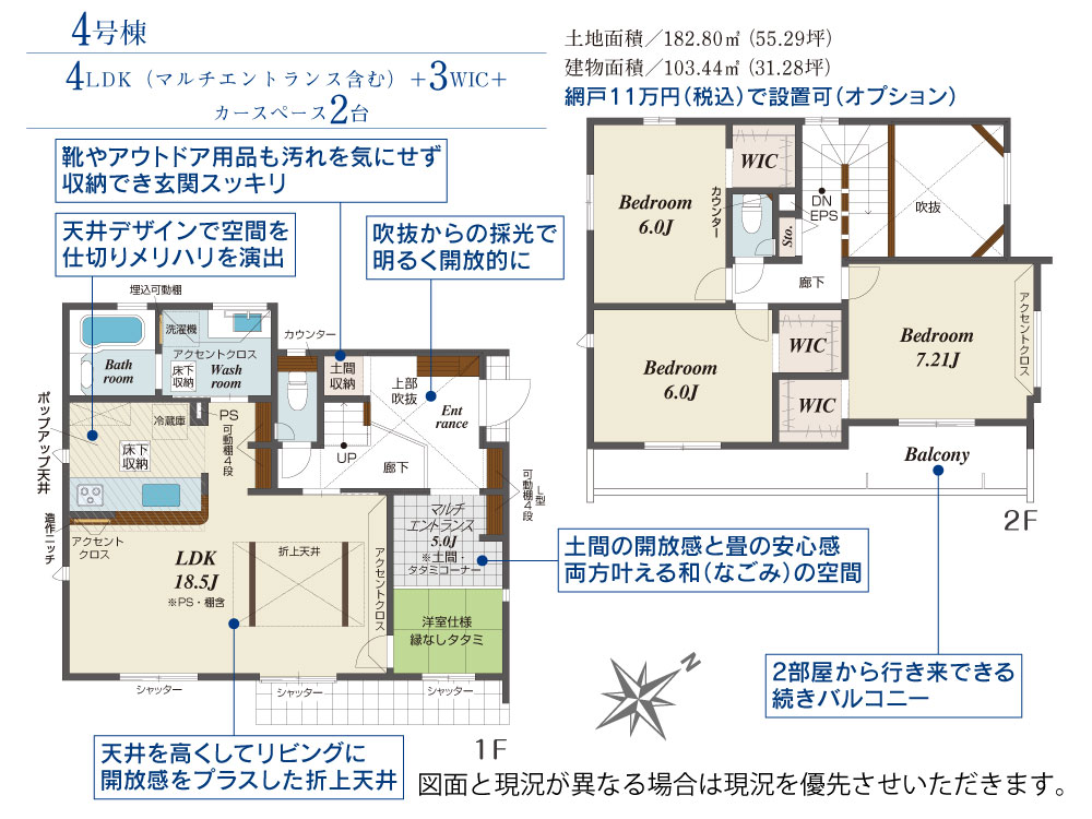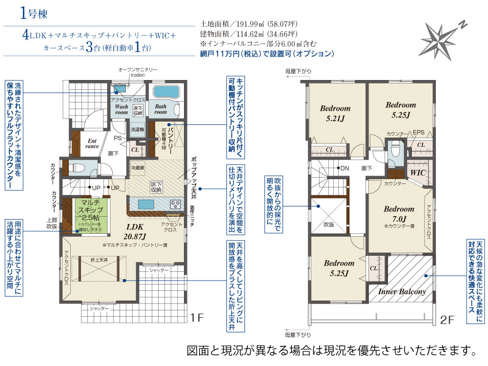 | 構造 | 木造 2階建 | 建物面積 | 103.44m2~114.62m2(31.29坪~34.67坪) |
