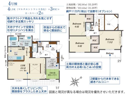 | 構造 | 木造 2階建 | 建物面積 | 103.44m2~114.62m2(31.29坪~34.67坪) |
